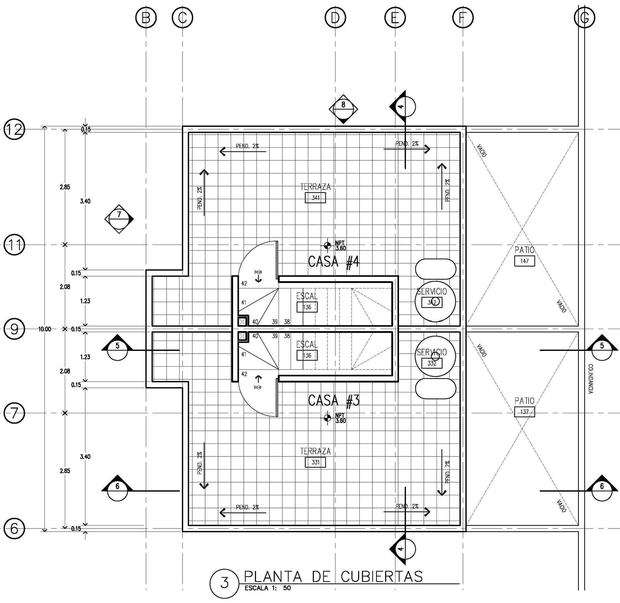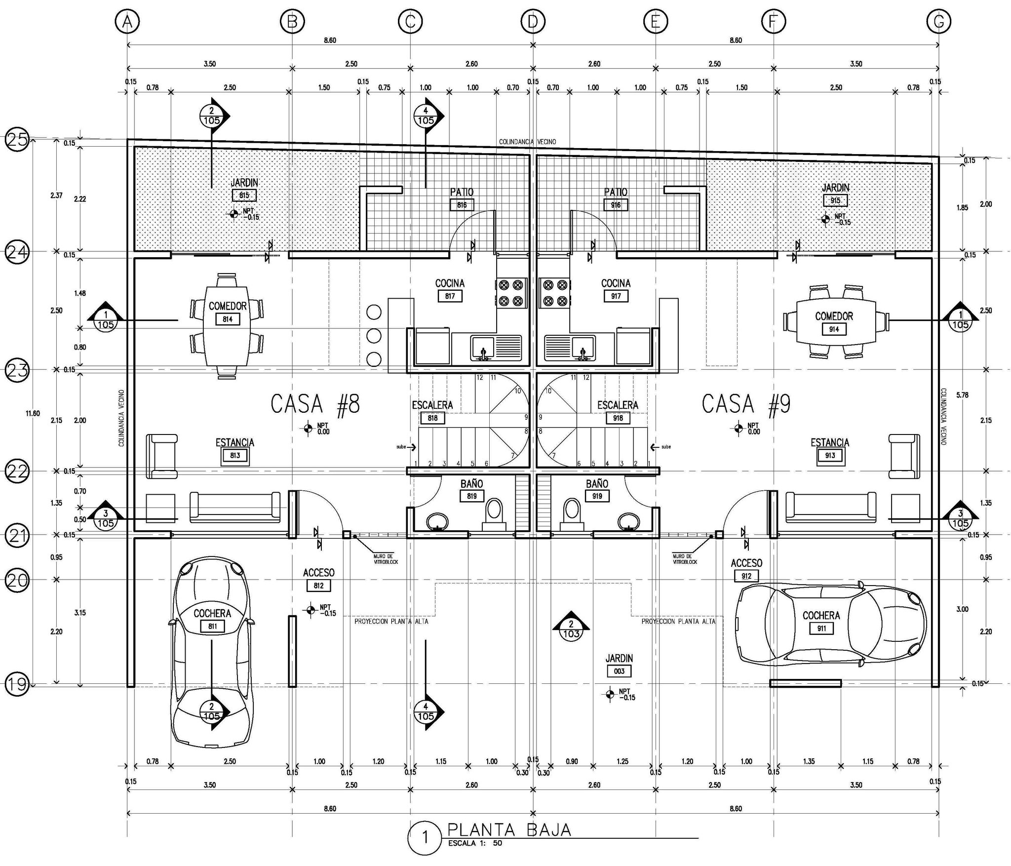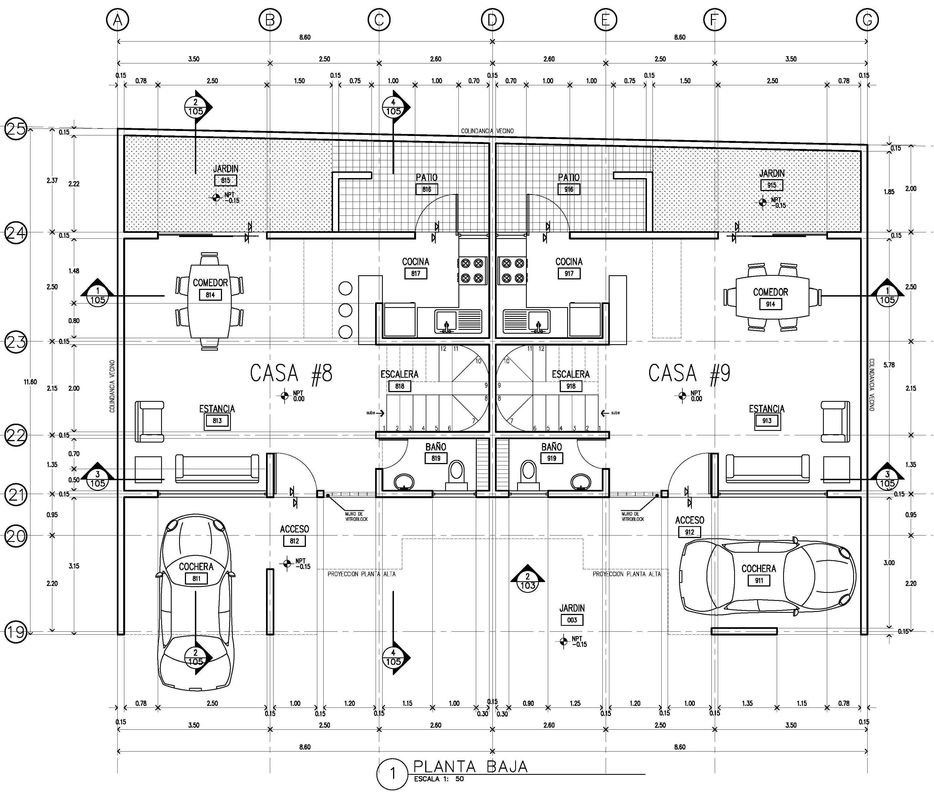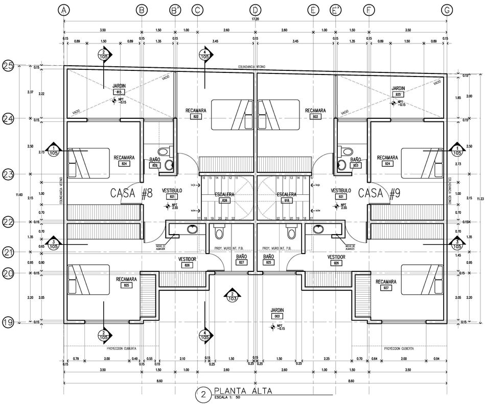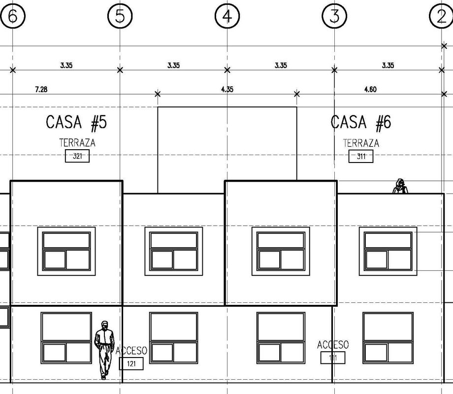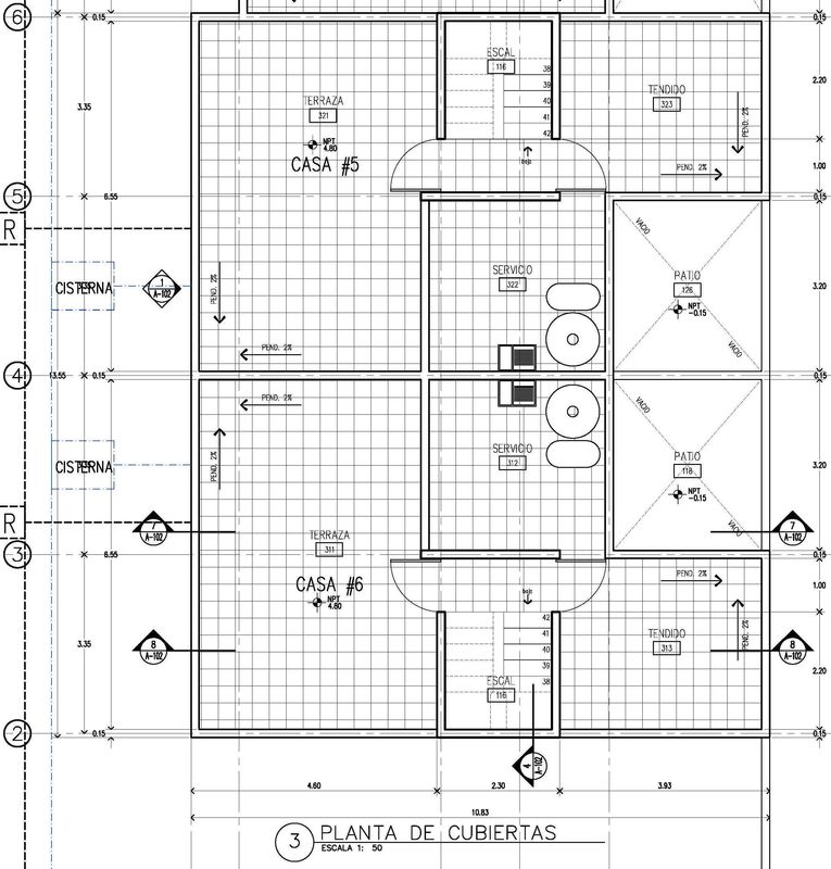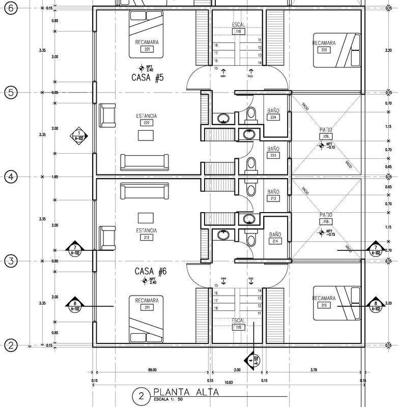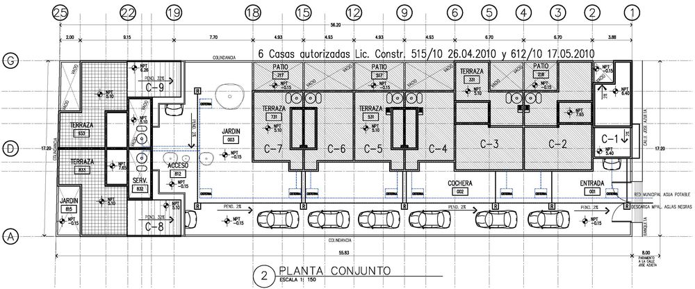 Respecto al proyecto, lo planeado fueron 9 viviendas (2 grandes, 4 chicas, 2 medianas, y 1 Loft), comenzando por el Loft y terminando al fondo con las grandes; esto en dos bloques, el primer bloque -contiene todas las viviendas menos las grandes- orientado en el costado derecho -orientación norte-; y en el fondo el segundo bloque con las viviendas grandes; todo ello a partir de espacios abiertos -acceso, cajones de estacionamiento, rotonda vehícular, banquetas en frentes, jardineras, etc.-, que permiten a la unidad respirar y no verse "apretada".