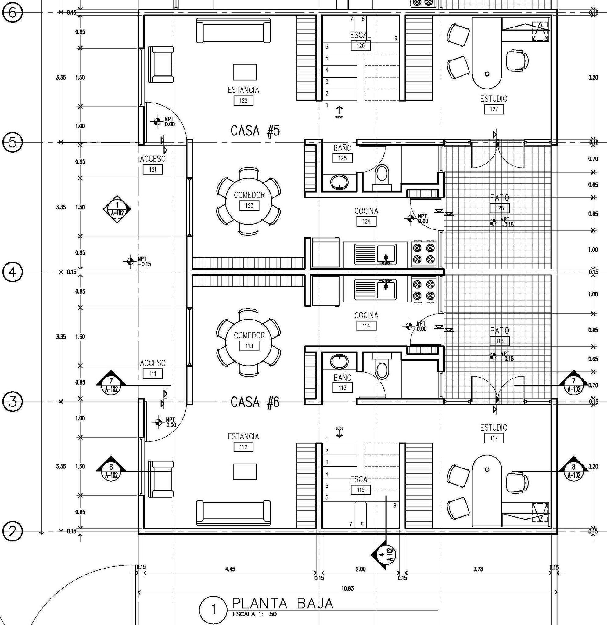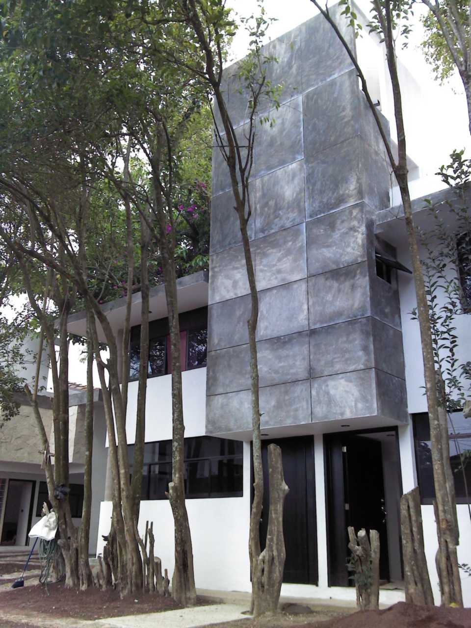 1.-En un terreno plano ubicado en pleno centro de la ciudad, con dimensiones de 17.50m de frente por 55.00m de fondo, elaborar un proyecto de viviendas tipo condómino de diversos tamaños para venta, en el cual se planteó espacios construidos y espacios abiertos, estacionamiento por vivienda, servicios subterráneos -agua, luz, teléfono, cable, etc.-, y cisternas enterradas. 2.-Todo ello a partir de la muestra de las viviendas ejecutadas en Lagos Cházaro, siendo un proyecto distinto por las características propias -construcción en el centro de la ciudad, pero diseñadas para evitar los inconvenientes por ello... ruido y polvo en exceso, exposición a los transeúntes, falta de privacidad, poca disponibilidad de estacionamientos, etc.-, pero semejante en cuanto al alcance previsto -homogeneidad en las fachadas, atemporalidad de las construcciones, exposición de los materiales constructivos-. 3.-En un principio se determinó construir cuatro viviendas pequeñas, dos viviendas medianas y dos viviendas grandes, comenzando con las pequeñas al frente y terminando con las grandes al fondo -por plusvalia-; posteriormente se replanteó el proyecto, pasando las viviendas pequeñas al centro del terreno -esto por la existencia de una hilera de árboles que se conservaron-, y se construyó una vivienda más en fachada, cuyas características la hacían ser un loft -espacio polifuncional tipo vivienda/estudio de trabajo- la cual sirvió de frente/fachada de la unidad. 4.-Como parte del diseño se planteó respetar la vegetación existente, y los espacios abiertos con el mínimo de alteración -rodadas de piedra para los vehículos en vez de pavimentación total; áreas engravilladas en vez de pavimentación total; áreas ajardinadas como espacios de transición entre las viviendas y lo vehicular; respetar las condiciones externas de las viviendas de los vecinos -alturas, niveles, cotas, directrices, materiales, colores, etc.-, a modo de homogeneizar la fachada principal. 5.-Siendo que se rescató la fachada con la homogeneidad, se contempló diferenciar lo nuevo de lo existente de forma sutil -si el vecino usó un retoque de ladrillos, acá se usó mediatabla; si el vecino usó aplanado rugoso, acá se usó aplanado fino; etc.-.