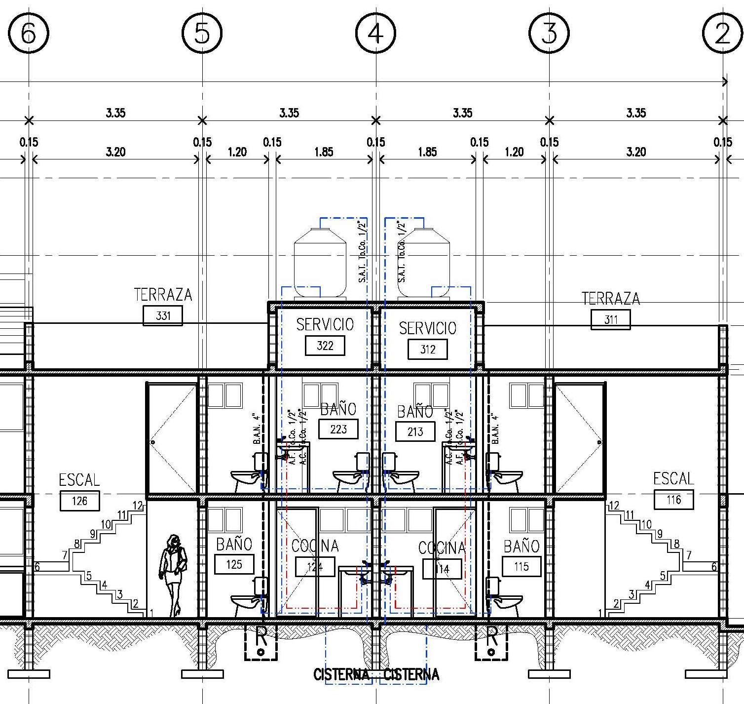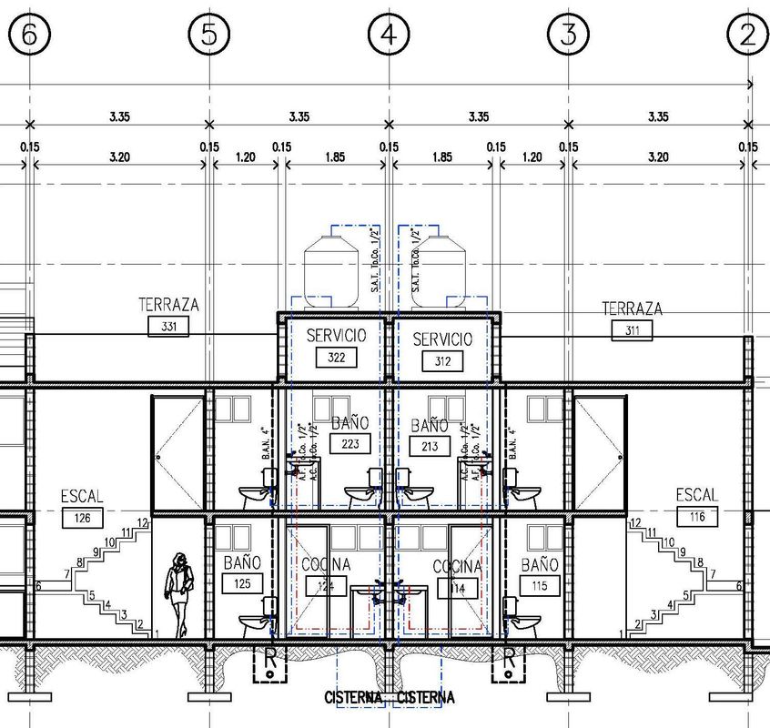 En el caso de las viviendas medianas, el prototipo es diferente ya que se planteó tener más espacios -un estudio en planta baja, una tercer recámara en planta alta, etc.-, pero con el esquema -tipo y tamaño de espacios, ubicaciones, funciones, etc.- como en las viviendas pequeñas. Por ello encontramos una estancia y un comedor al frente con un acceso trampeado; una cocina, un medio baño y un patio de servicio como un único módulo que comparten instalaciones; unas escaleras flotantes centradas respecto a la vivienda que sigue el pasillo hacia un área alcobable; en la planta alta encontramos tres recámaras, una con baño completo al interior, y las otras dos con baño compartido; y de igual forma que en la vivienda pequeña, la azotea es un área de servicio -lavandería, tendido, etc.-, y de disfrute -terraza con banca de material-.