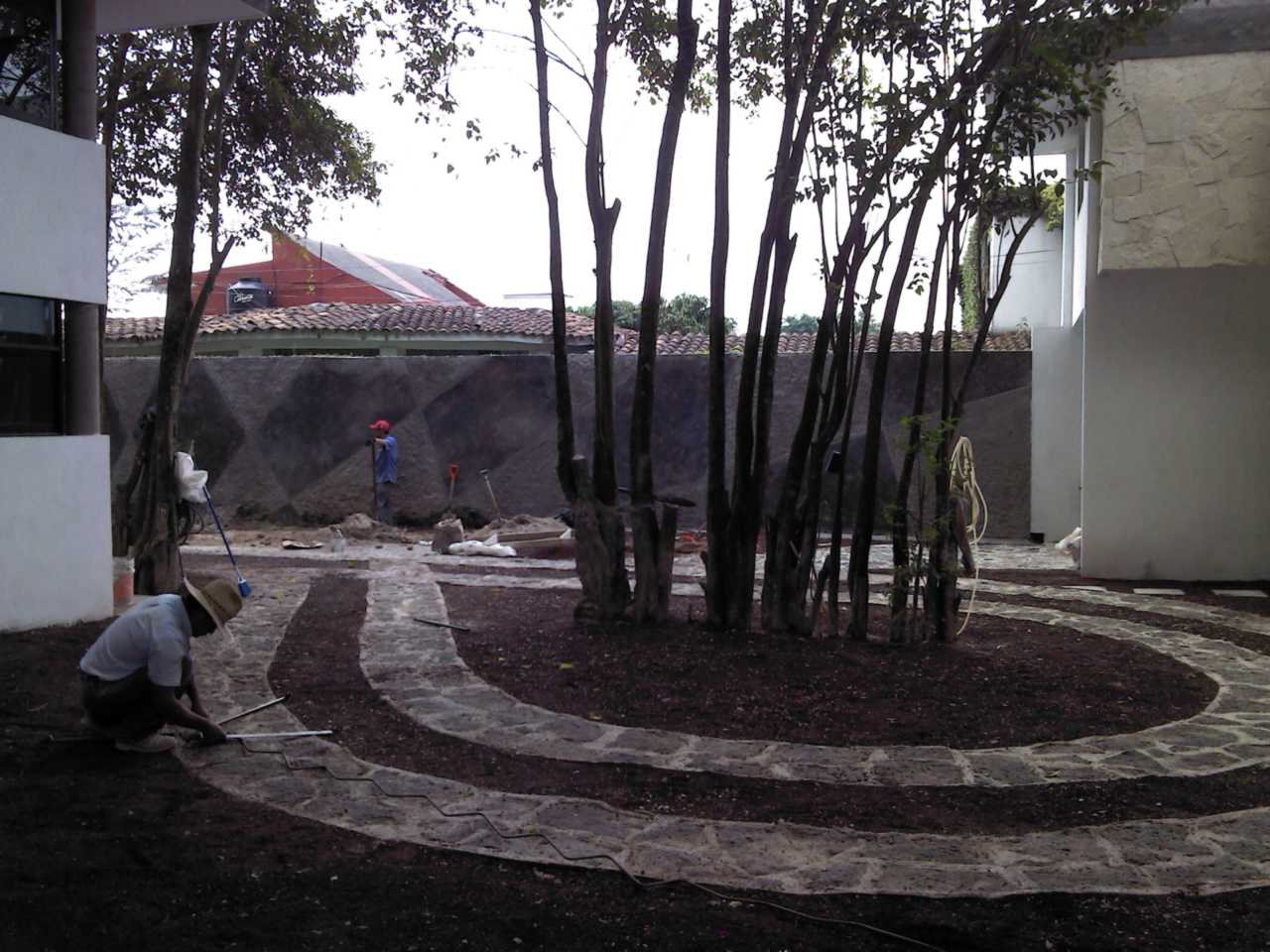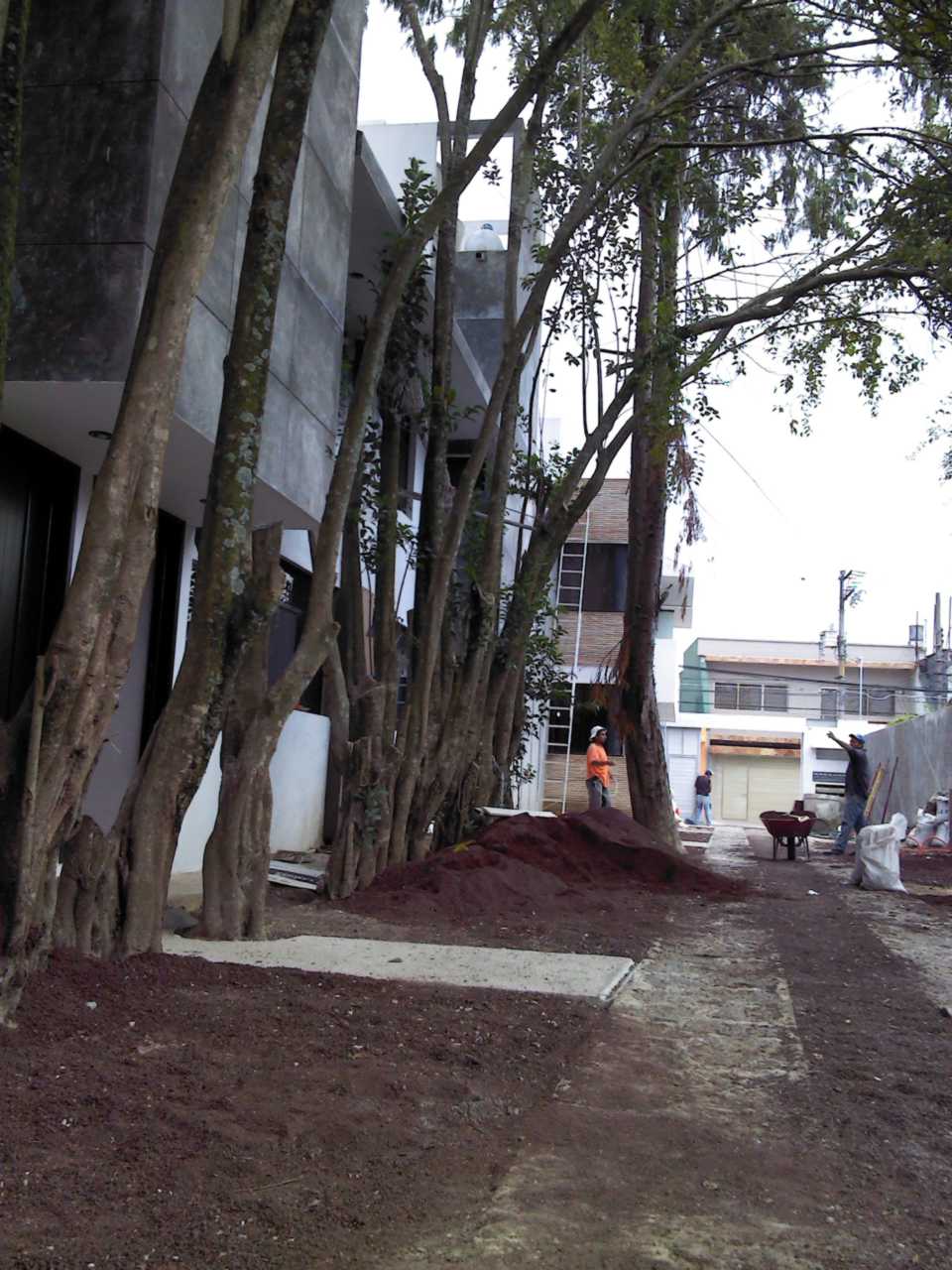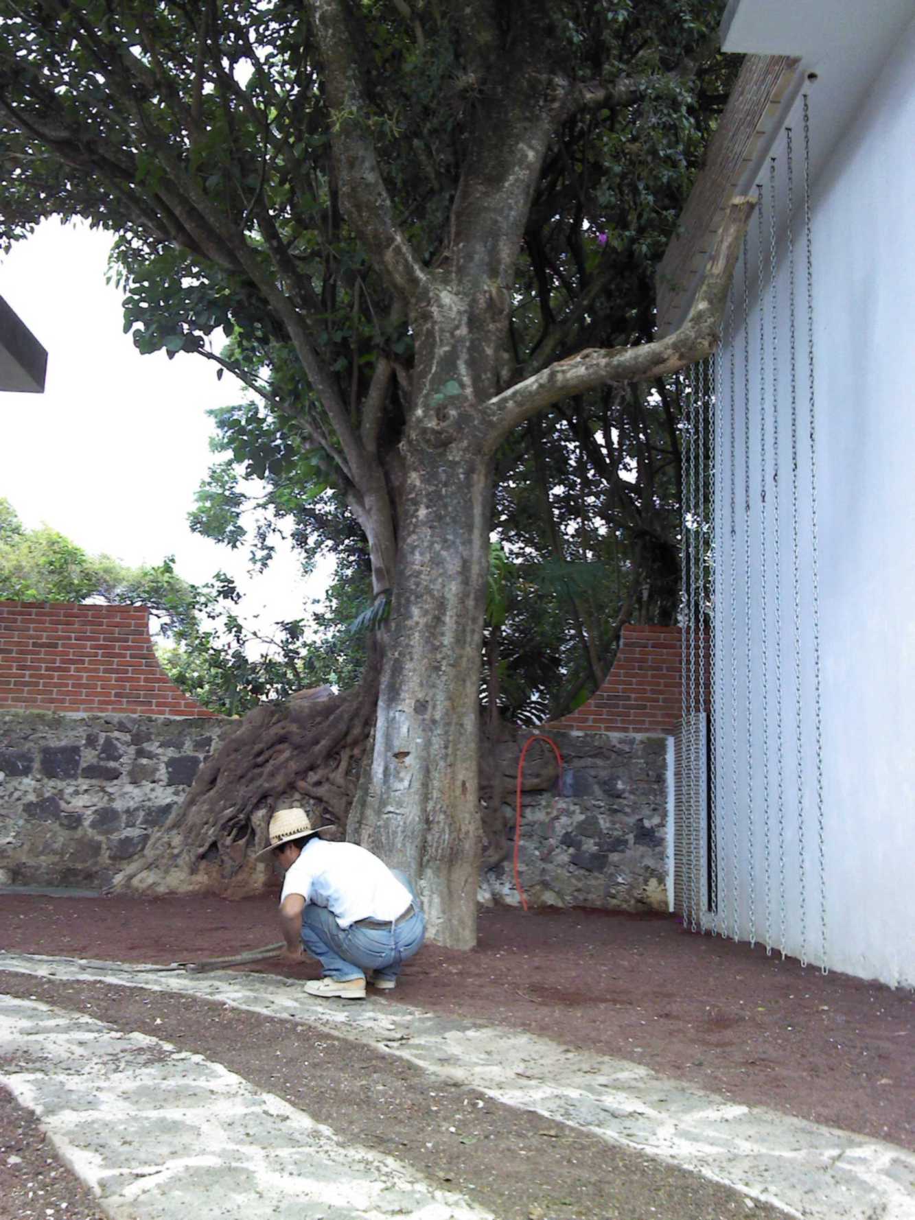 Actualmente una parte de los árboles que se conservaron no están -bien me decía el vecino extinto, si los árboles dieran señal de internet, todos los cuidarían-, pero afortunadamente se han conservado los espacios verdes con árboles de ornamentación que permiten darle vida al espacio abierto. También los árboles que están son los cuidados por los habitantes que disfrutan de lo verde, y entre ellos se encuentra un árbol único que tiene la curiosidad de haber crecido sobre el tapial de piedra divisorio -ambos vecinos aceptaron conservarlo-, y se enmarcó como parte del diseño mismo.